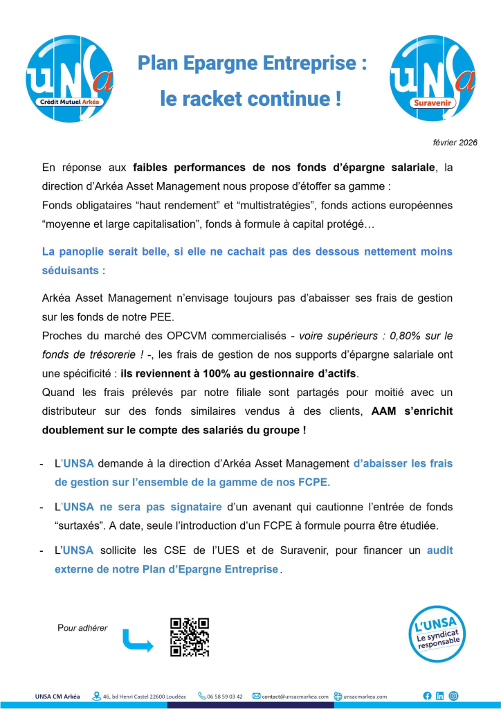 Ce document explicite les raisons pour lesquelles l’UNSA ne sera pas signataire du projet d’avenant portĂ© par ArkĂ©a Asset Management, sur l’Ă©volution de notre Plan d’Epargne Entreprise.
